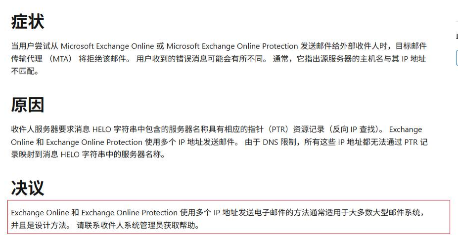 由于EXO使用的出站IP池很大,微软无法为所有IP都设置指向客户特定域的PTR记录,因此此查询很可能失败或不匹配,导致对方服务器拒绝接收邮件